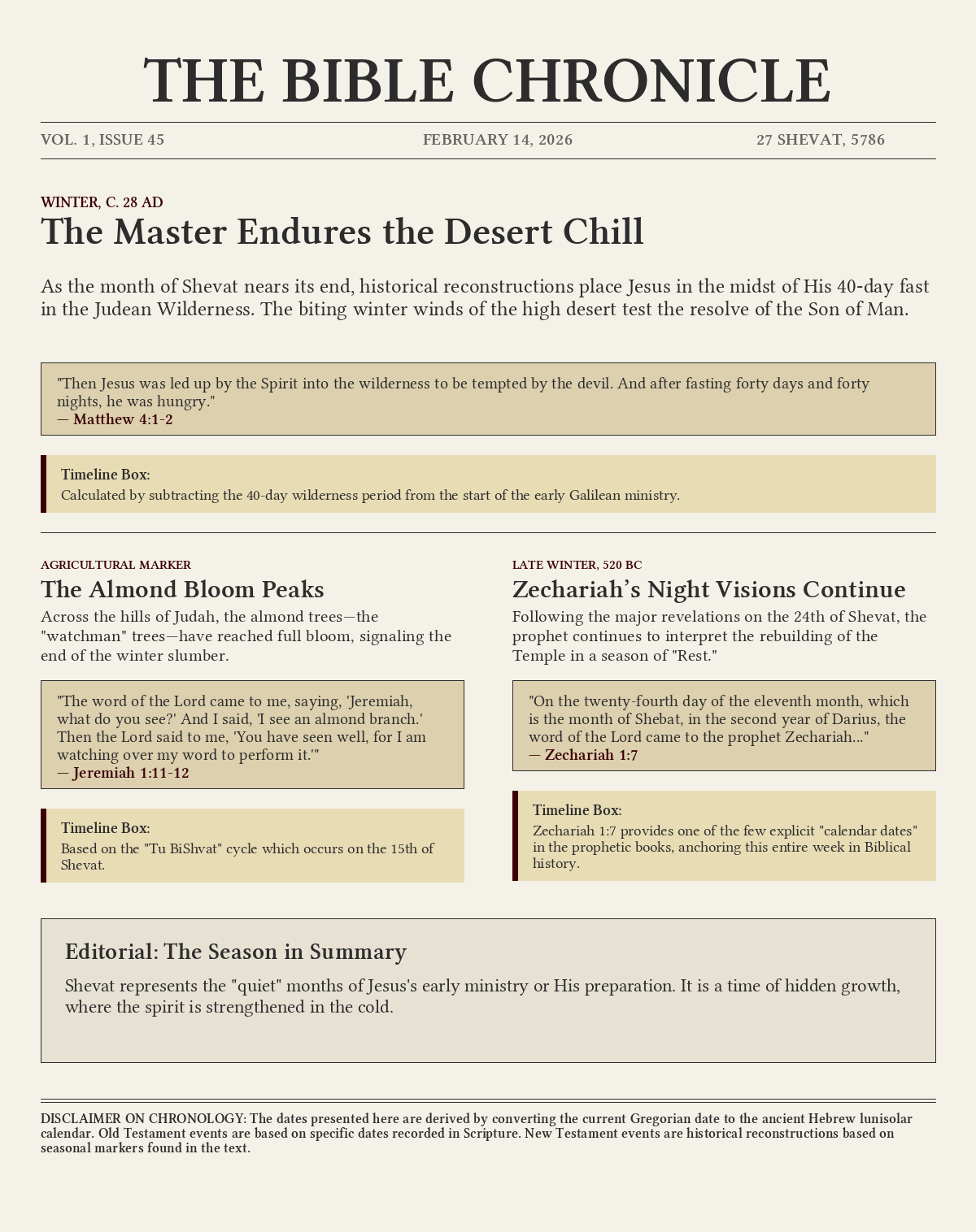 As the month of Shevat nears its end, historical reconstructions place Jesus in the midst of His 40-day fast in the Judean Wilderness. The biting winter winds of the high desert test the resolve of the Son of Man.