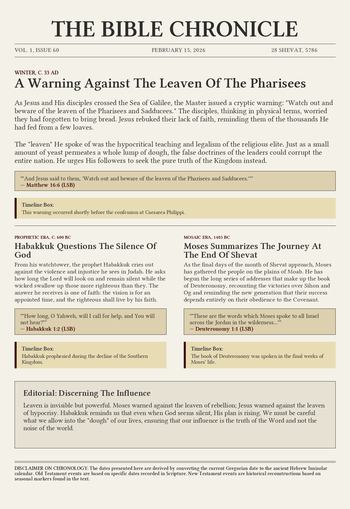 As Jesus and His disciples crossed the Sea of Galilee, the Master issued a cryptic warning: "Watch out and beware of the leaven of the Pharisees and Sadducees." The disciples, thinking in physical terms, worried they had forgotten to bring bread. Jesus rebuked their lack of faith, reminding them of the thousands He had fed from a few loaves.