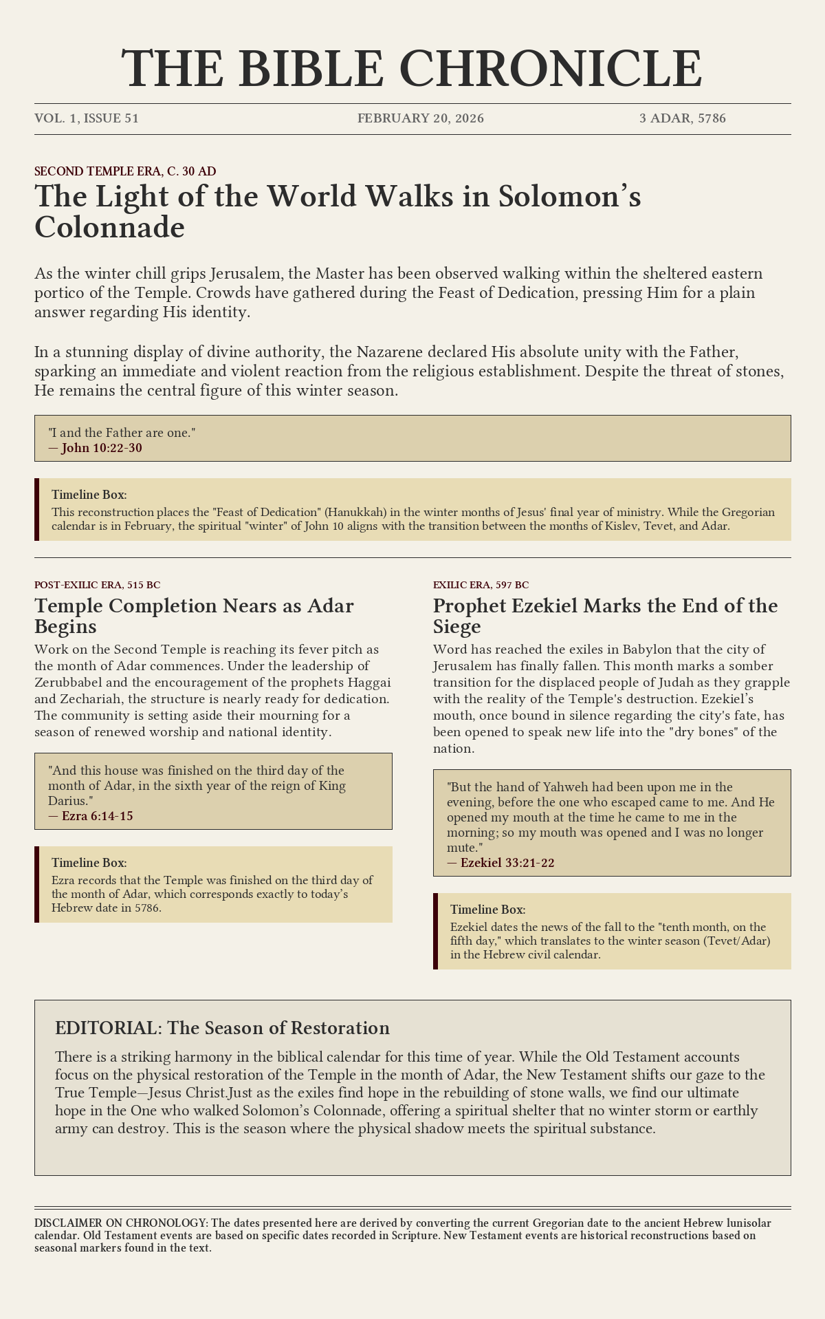 As the winter chill grips Jerusalem, the Master has been observed walking within the sheltered eastern portico of the Temple. Crowds have gathered during the Feast of Dedication, pressing Him for a plain answer regarding His identity.