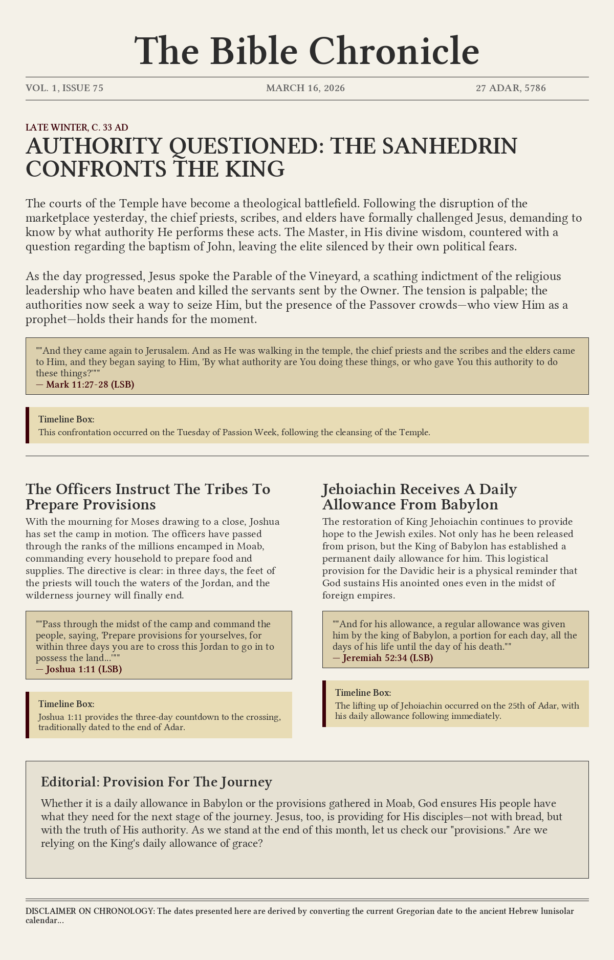 The courts of the Temple have become a theological battlefield. Following the disruption of the marketplace yesterday, the chief priests, scribes, and elders have formally challenged Jesus, demanding to know by what authority He performs these acts. The Master, in His divine wisdom, countered with a question regarding the baptism of John, leaving the elite silenced by their own political fears.