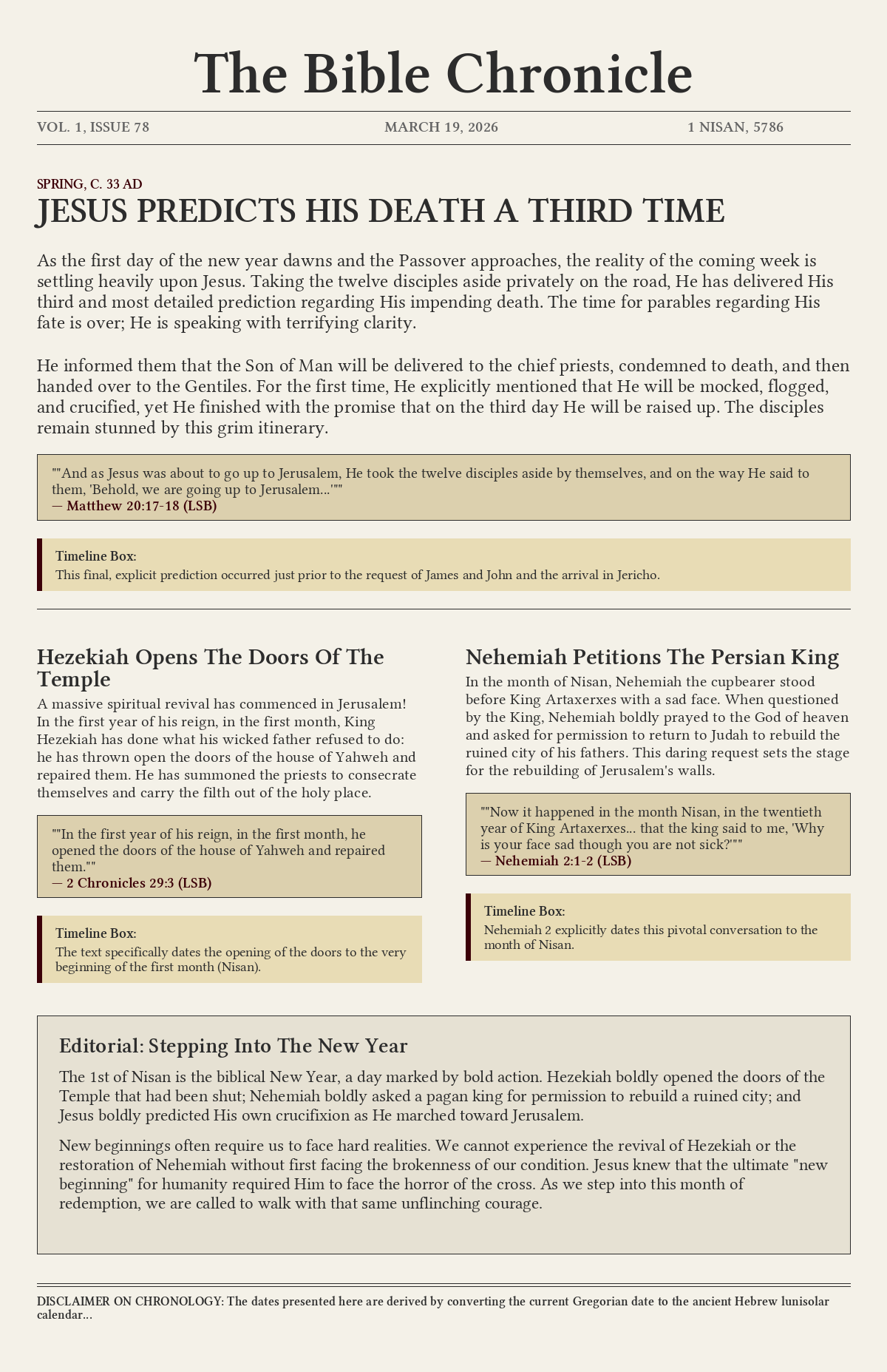 As the first day of the new year dawns and the Passover approaches, the reality of the coming week is settling heavily upon Jesus. Taking the twelve disciples aside privately on the road, He has delivered His third and most detailed prediction regarding His impending death. The time for parables regarding His fate is over; He is speaking with terrifying clarity.