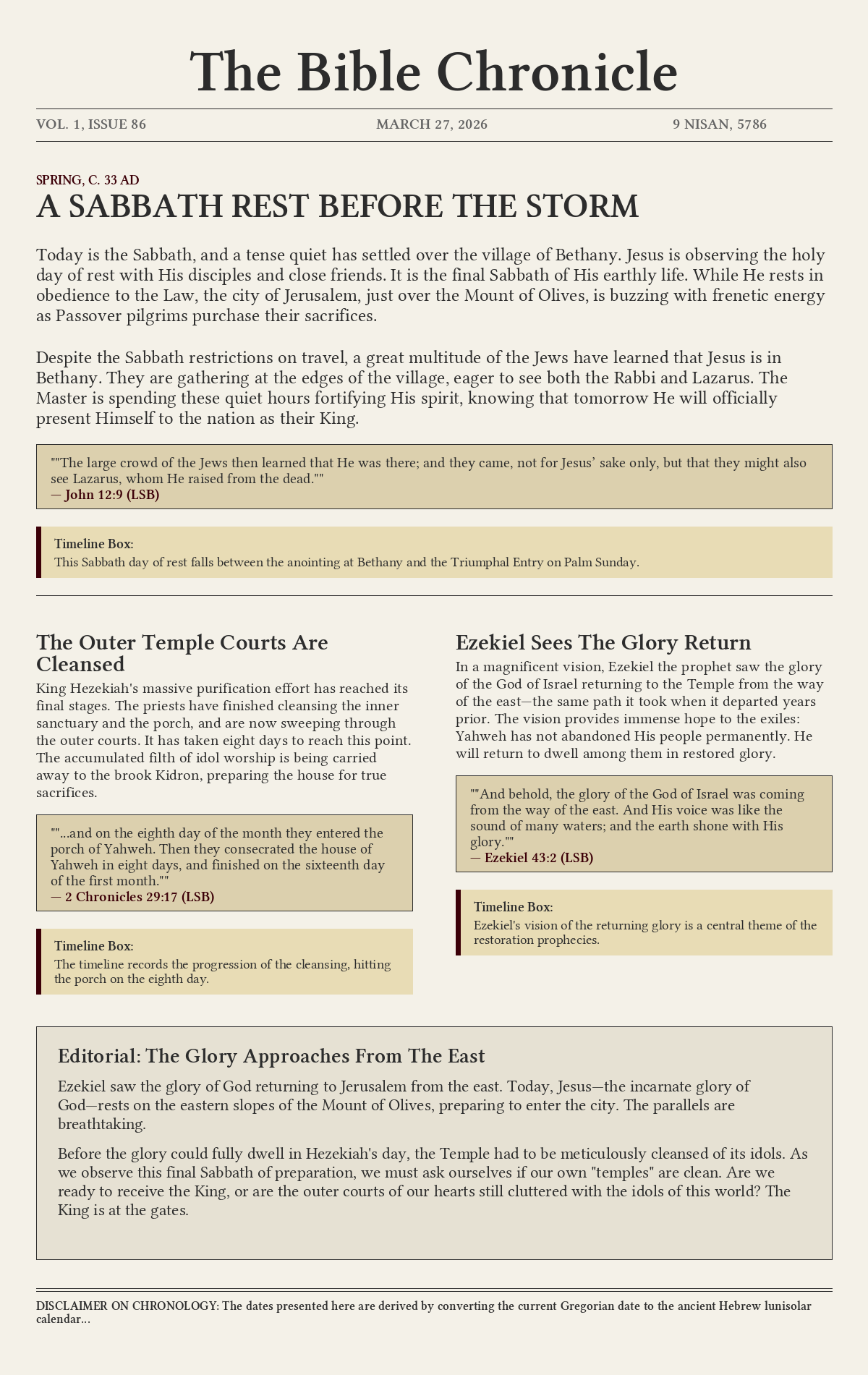 Today is the Sabbath, and a tense quiet has settled over the village of Bethany. Jesus is observing the holy day of rest with His disciples and close friends. It is the final Sabbath of His earthly life. While He rests in obedience to the Law, the city of Jerusalem, just over the Mount of Olives, is buzzing with frenetic energy as Passover pilgrims purchase their sacrifices.