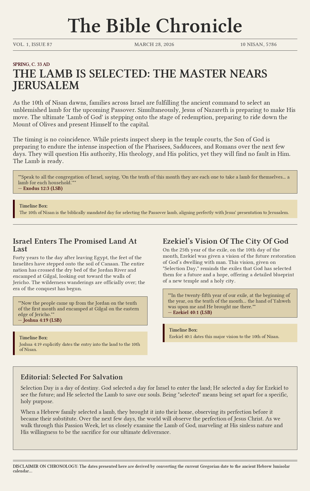 As the 10th of Nisan dawns, families across Israel are fulfilling the ancient command to select an unblemished lamb for the upcoming Passover. Simultaneously, Jesus of Nazareth is preparing to make His move. The ultimate 'Lamb of God' is stepping onto the stage of redemption, preparing to ride down the Mount of Olives and present Himself to the capital.