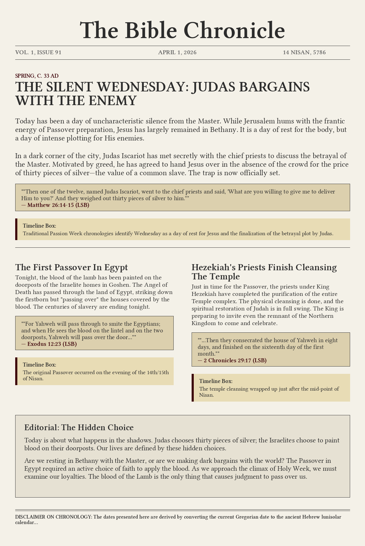 Today has been a day of uncharacteristic silence from the Master. While Jerusalem hums with the frantic energy of Passover preparation, Jesus has largely remained in Bethany. It is a day of rest for the body, but a day of intense plotting for His enemies.