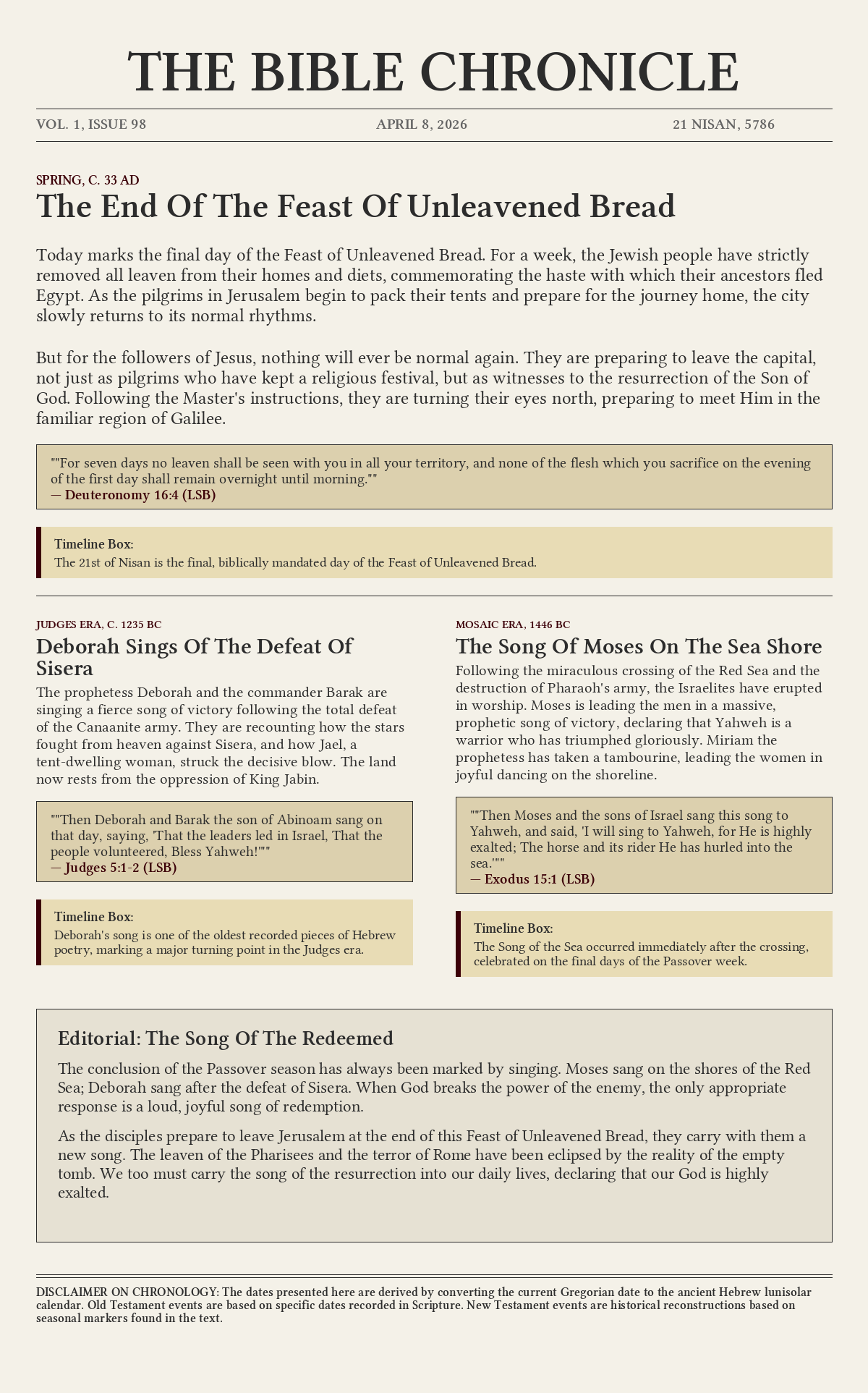 Today marks the final day of the Feast of Unleavened Bread. For a week, the Jewish people have strictly removed all leaven from their homes and diets, commemorating the haste with which their ancestors fled Egypt. As the pilgrims in Jerusalem begin to pack their tents and prepare for the journey home, the city slowly returns to its normal rhythms.