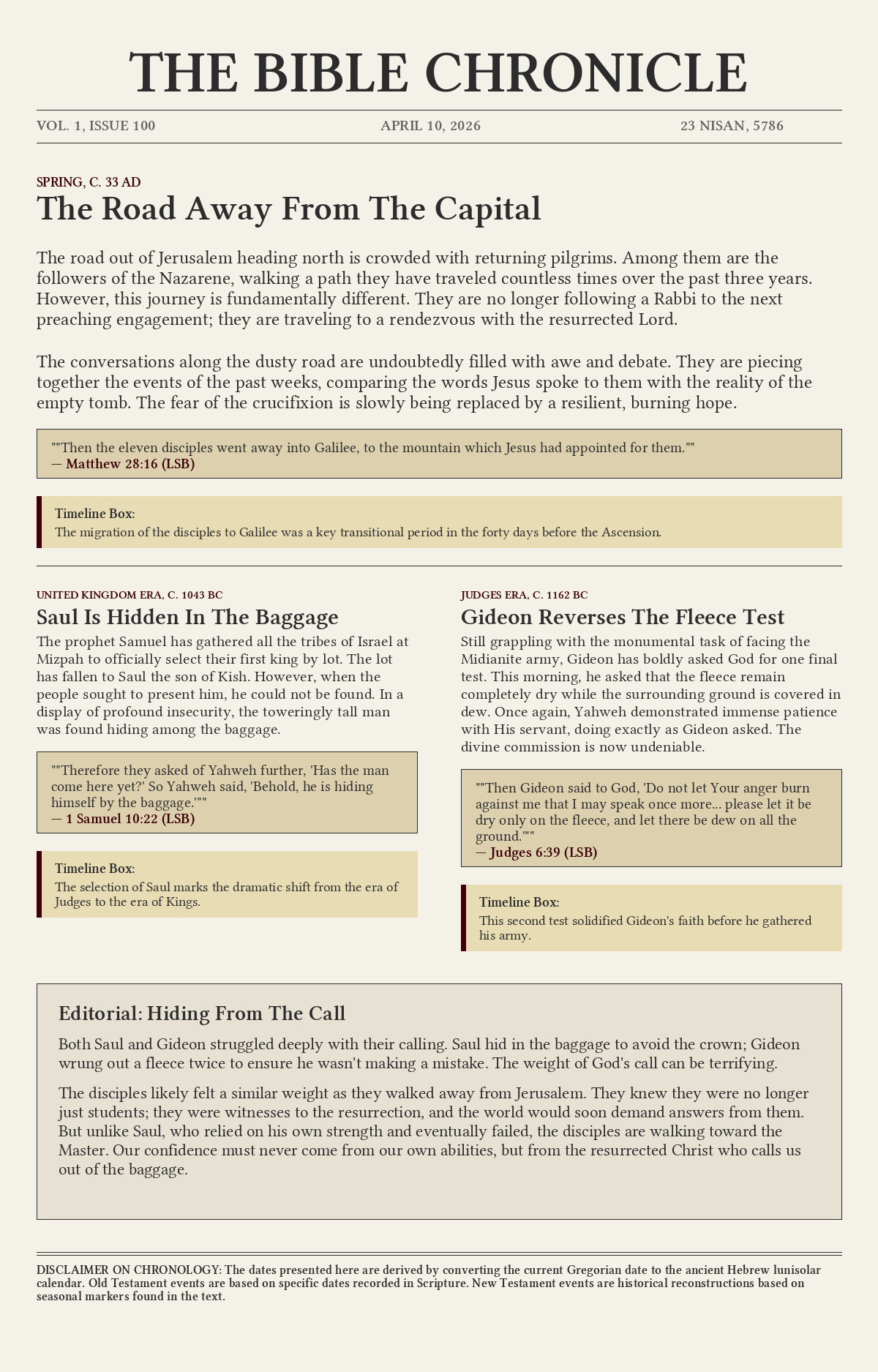 The road out of Jerusalem heading north is crowded with returning pilgrims. Among them are the followers of the Nazarene, walking a path they have traveled countless times over the past three years. However, this journey is fundamentally different. They are no longer following a Rabbi to the next preaching engagement; they are traveling to a rendezvous with the resurrected Lord.