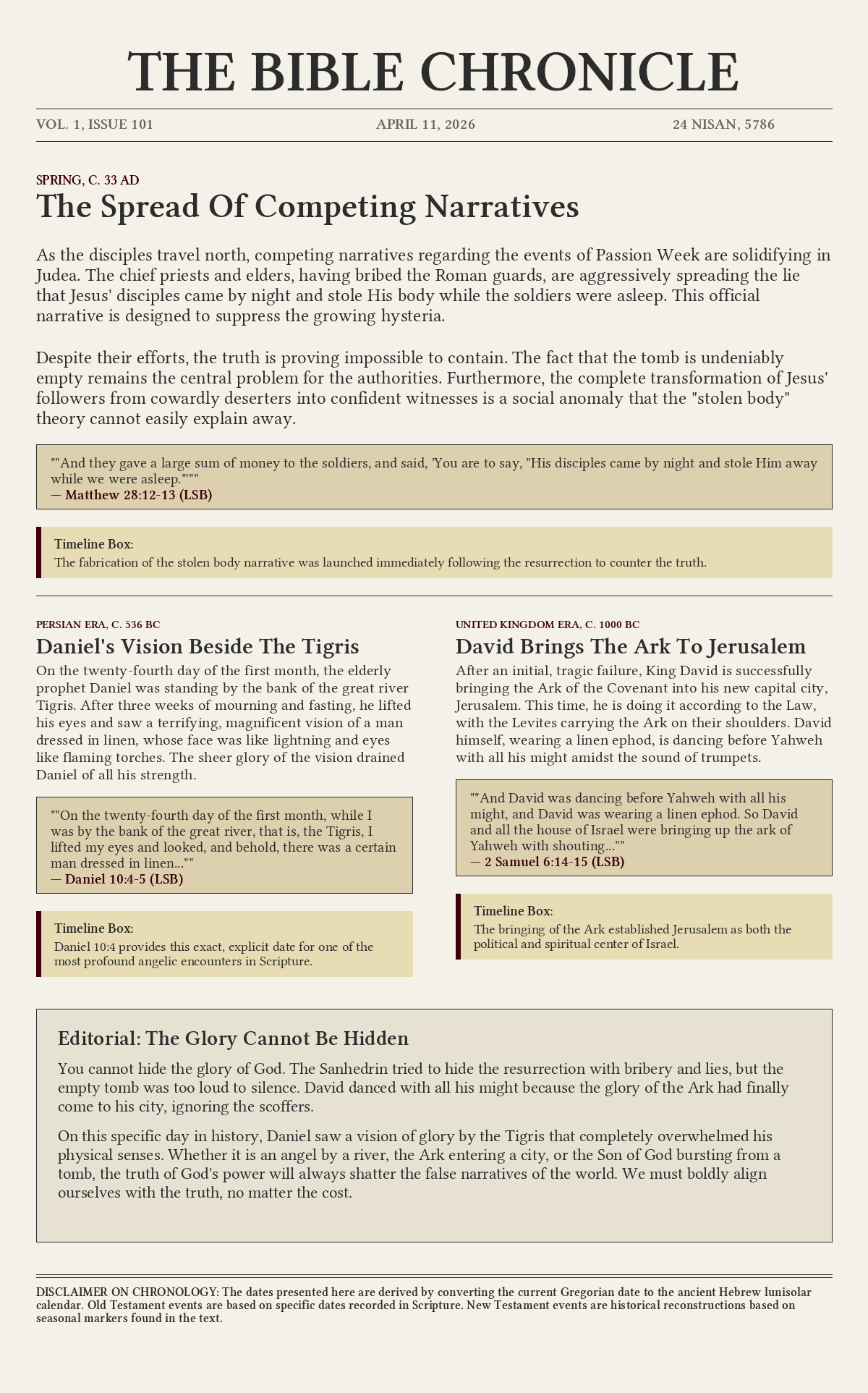 On this specific day in history, Daniel saw a vision of glory by the Tigris that completely overwhelmed his physical senses. Whether it is an angel by a river, the Ark entering a city, or the Son of God bursting from a tomb, the truth of God's power will always shatter the false narratives of the world. We must boldly align ourselves with the truth, no matter the cost.