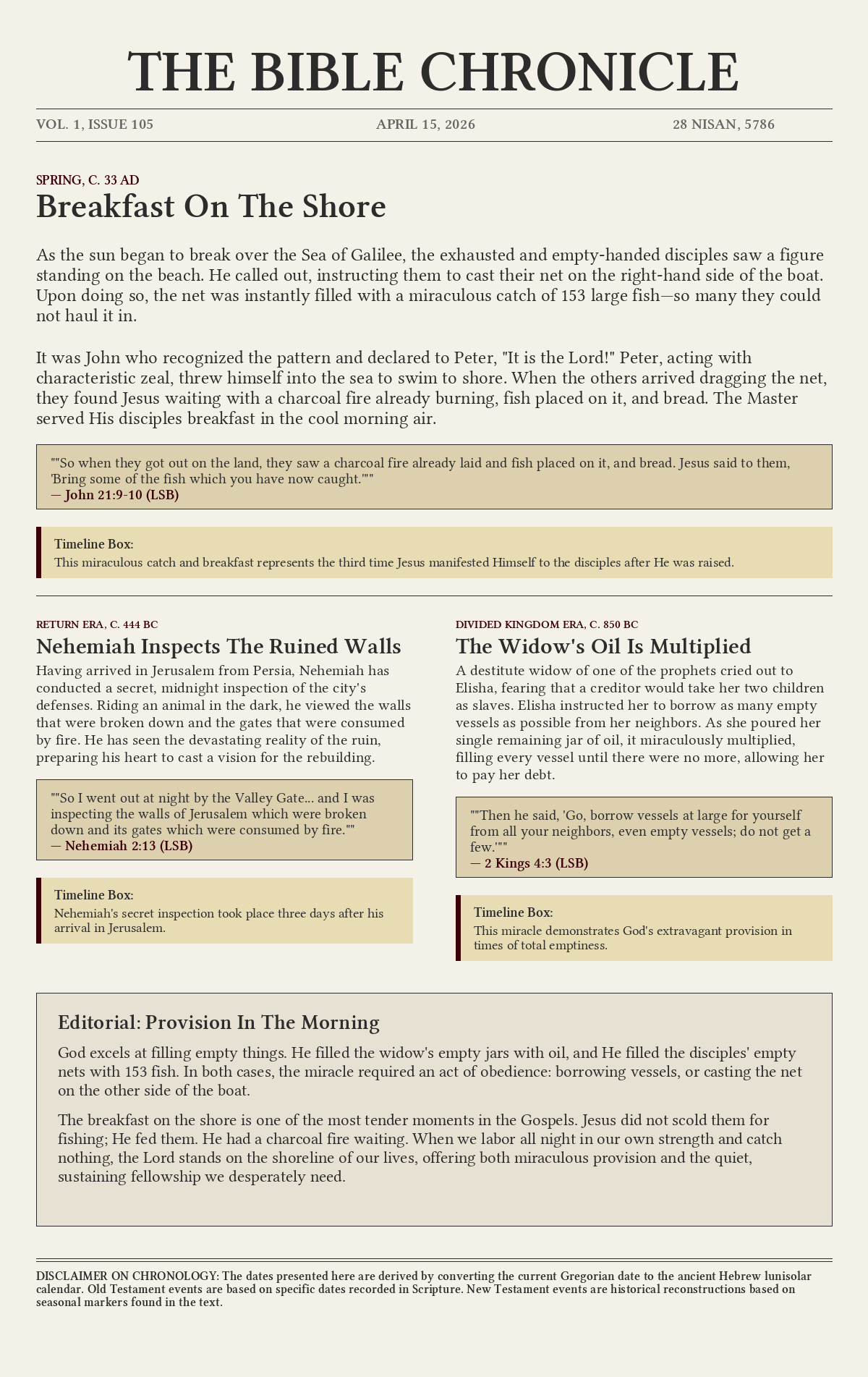 It was John who recognized the pattern and declared to Peter, "It is the Lord!" Peter, acting with characteristic zeal, threw himself into the sea to swim to shore. When the others arrived dragging the net, they found Jesus waiting with a charcoal fire already burning, fish placed on it, and bread. The Master served His disciples breakfast in the cool morning air.