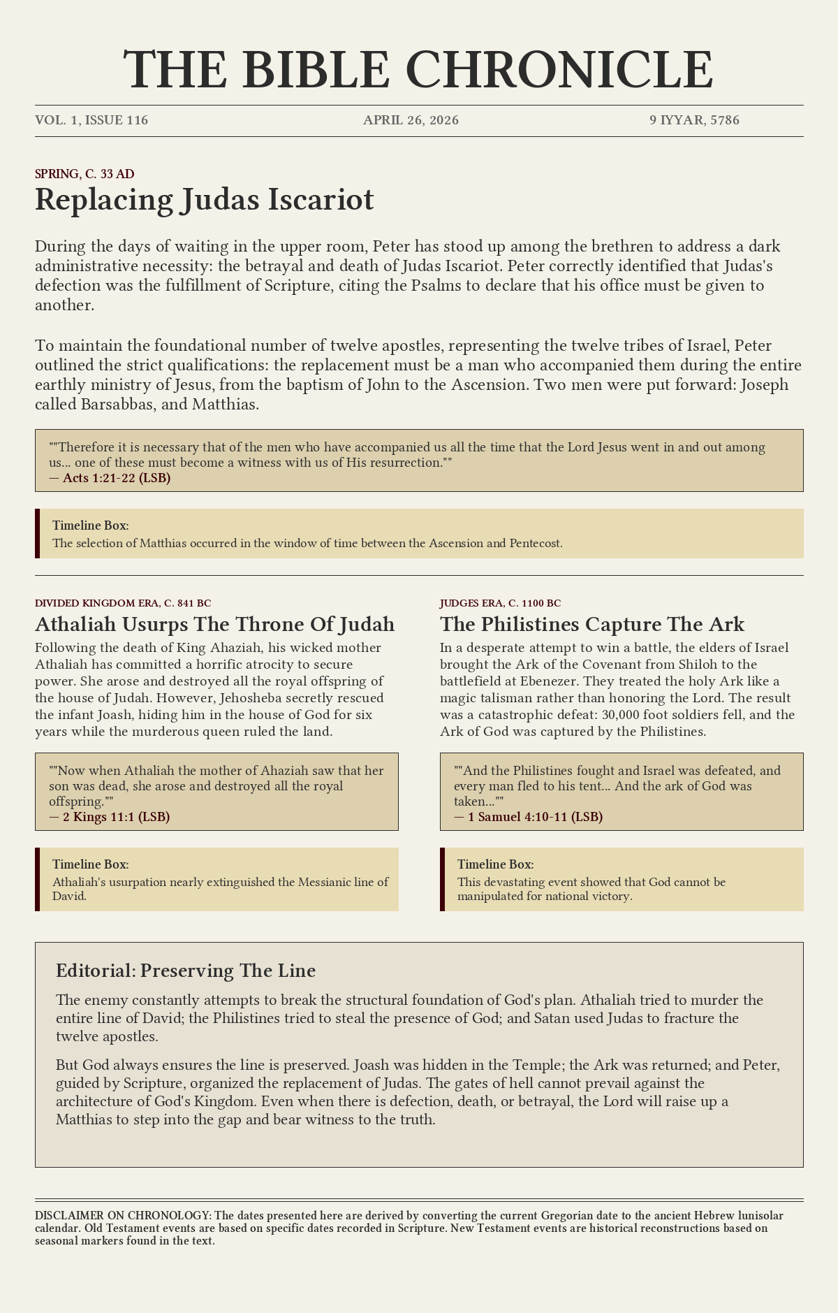 During the days of waiting in the upper room, Peter has stood up among the brethren to address a dark administrative necessity: the betrayal and death of Judas Iscariot. Peter correctly identified that Judas's defection was the fulfillment of Scripture, citing the Psalms to declare that his office must be given to another.