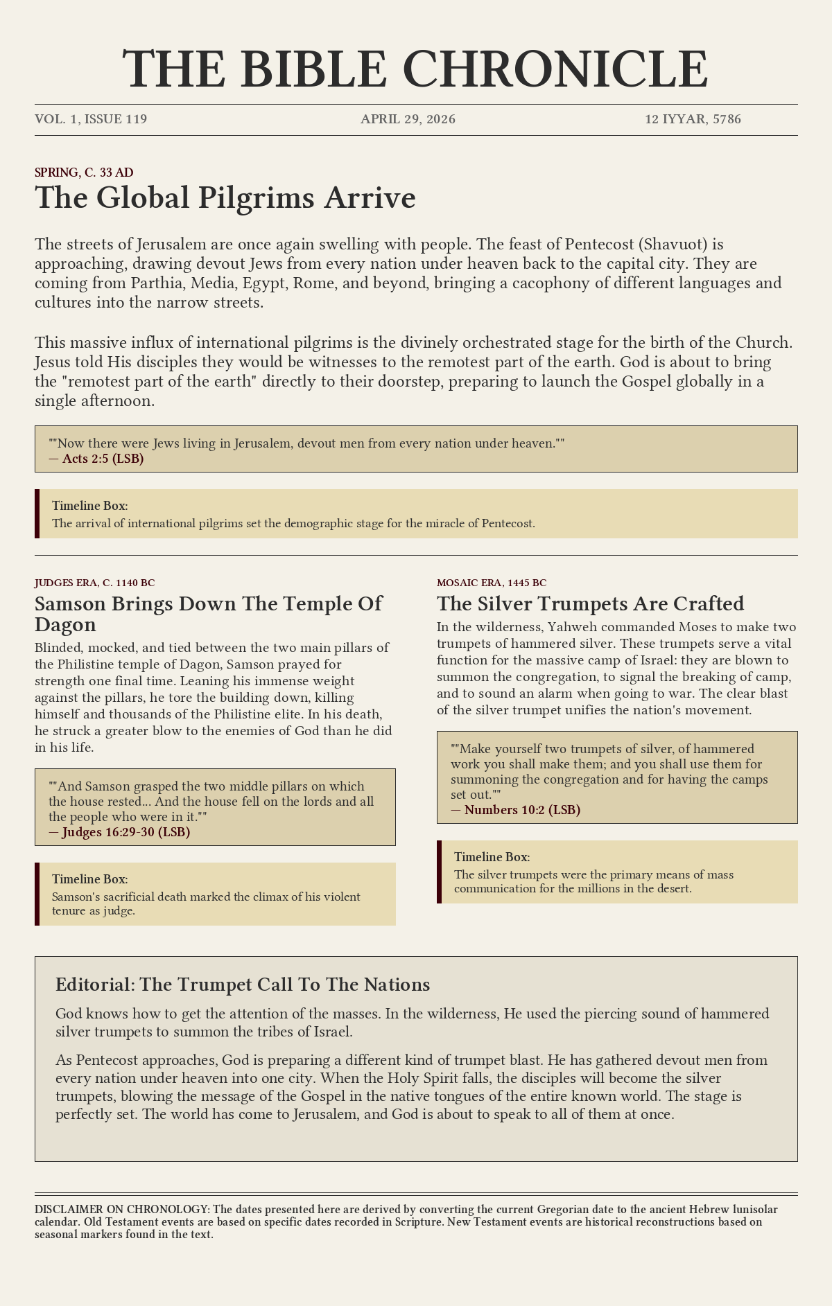 The streets of Jerusalem are once again swelling with people. The feast of Pentecost (Shavuot) is approaching, drawing devout Jews from every nation under heaven back to the capital city. They are coming from Parthia, Media, Egypt, Rome, and beyond, bringing a cacophony of different languages and cultures into the narrow streets.