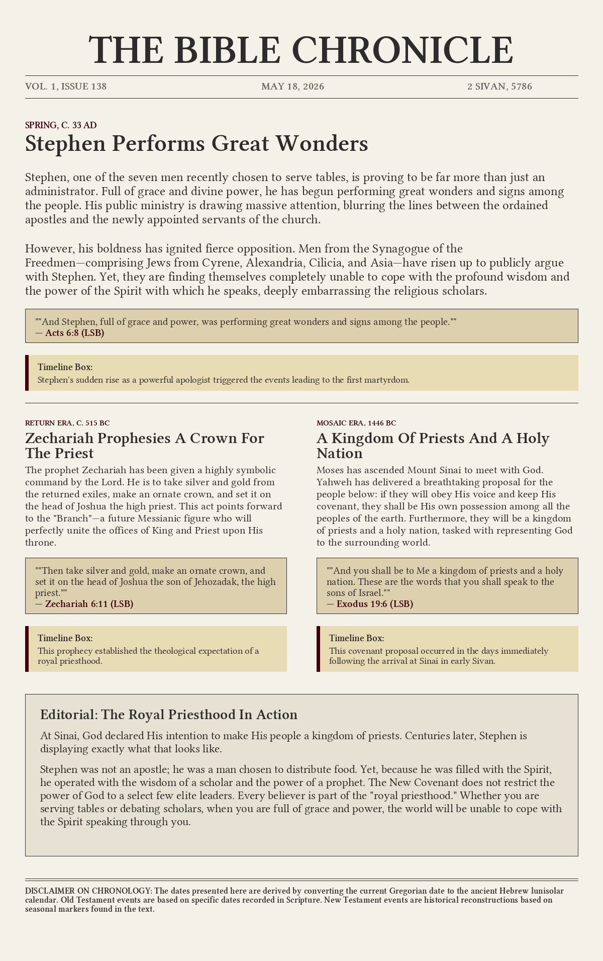 Stephen, one of the seven men recently chosen to serve tables, is proving to be far more than just an administrator. Full of grace and divine power, he has begun performing great wonders and signs among the people. His public ministry is drawing massive attention, blurring the lines between the ordained apostles and the newly appointed servants of the church.