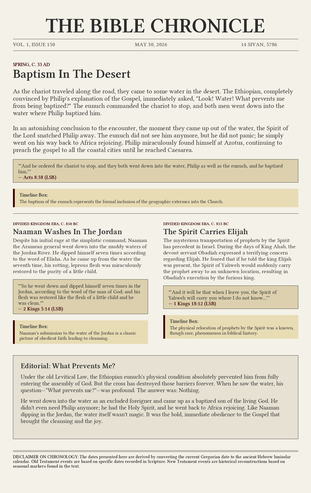 As the chariot traveled along the road, they came to some water in the desert. The Ethiopian, completely convinced by Philip's explanation of the Gospel, immediately asked, "Look! Water! What prevents me from being baptized?" The eunuch commanded the chariot to stop, and both men went down into the water where Philip baptized him.